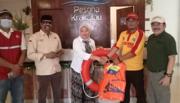 Prosesi penyerahan alat keselamatan disaksikan langsung oleh Kepala Dinas Pariwisata Provinsi Banten, Al-Hamidi dan Ketua PHRI Provinsi Banten, Ashok sambil kunjungan menjelang liburan hari raya idul fitri 1444 Hijriah.