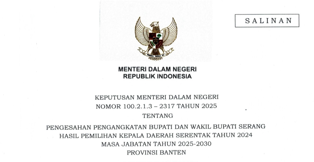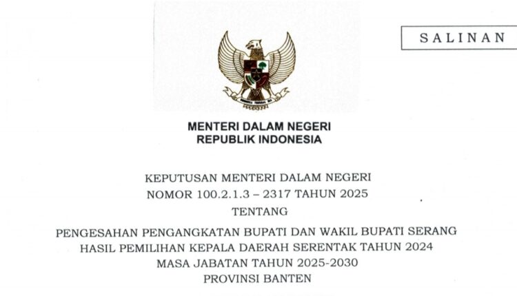 SERANG – Menteri Dalam Negeri (Mendagri) Jenderal (Purn) Muhammad Tito Karnavian telah resmi mengeluarkan surat keputusan (SK) Nomor 100.2.1.3-2317 Tahun 2025, pada Jum’at (23/5/2025).