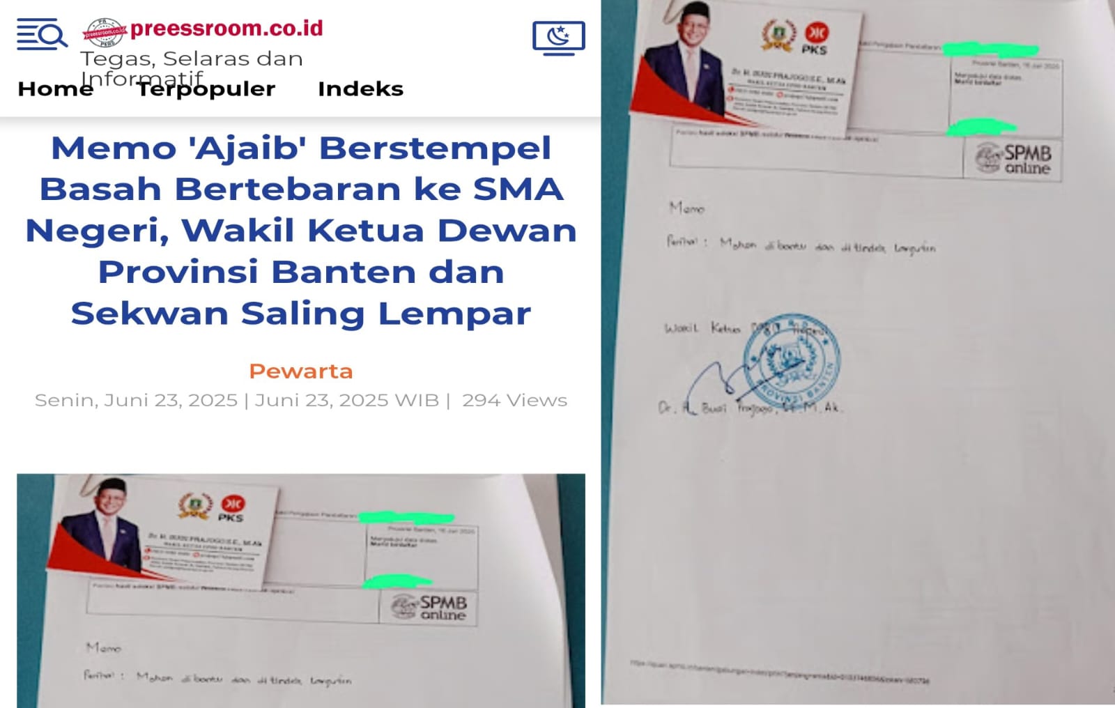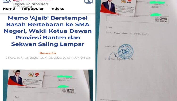 SERANG – Wakil Ketua DPRD Banten Budi Prajogo mengakui perihal memo yang bertandatangan dan terdapat foto dirinya yang menitipkan seorang calon murid di SPMB.