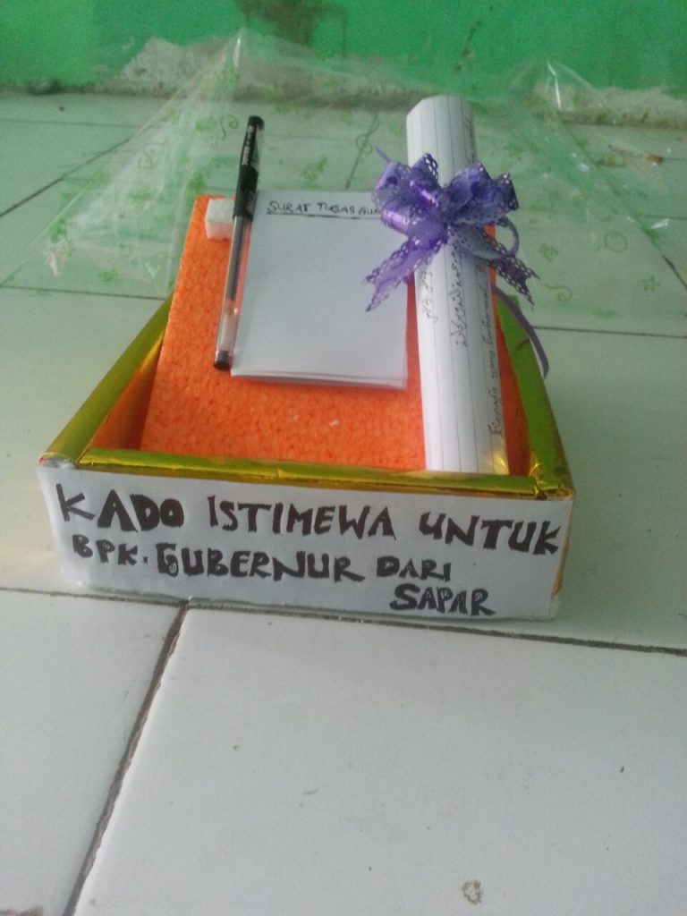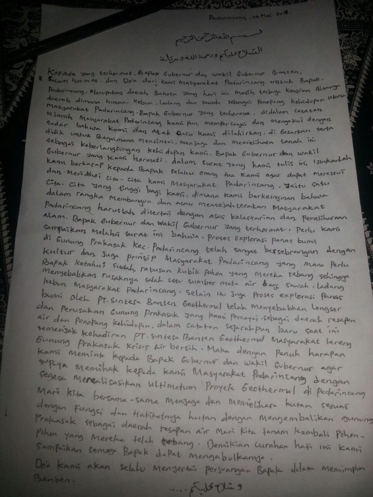 Ia menjelaskan, surat yang ditulis tangan tersebut adalah hasil rumusan dari musyawarah yang telah dilakukan. Sementara itu, kado sendiri sebagai simbol bagi mereka (Sapar) dalam meminta Pemprov Banten segera membuat surat tugas untuk para penegak hukum agar secepatnya menurunkan alat berat yang masih berada di atas Gunung Prakasak.
