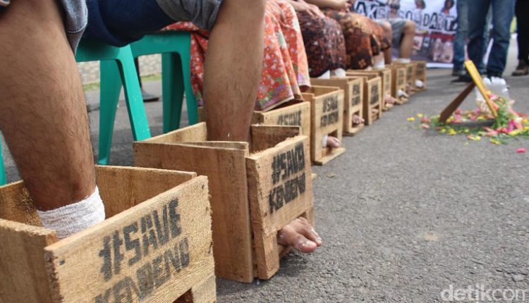 Para pengunjuk rasa menolak pabrik Semen di Rembang, Jawa Tengah. Demonstrasi itu sekaligus menentang pendirian pabrik air minum kemasan milik Mayora Group di dua wilayah, yakni di Kecamatan Baros, Kabupaten Serang; dan Kecamatan Cadasari, Kabupaten Pandeglang, Banten.