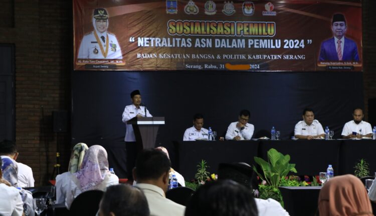 SERANG – Badan Kesatuan Bangsa dan Politik (Bakesbangpol) Kabupaten Serang mensosialisasikan netralitas bagi para Aparatur Sipil Negara atau ASN di lingkungan Pemerintah Kabupaten (Pemkab) Serang di Forbis Hotel, Kecamatan Waringin Kurung pada Rabu, (31/1/2024).