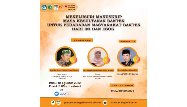 SERANG – UPTD Taman Budaya dan Museum pada Dinas Pendidikan dan Kebudayaan Provinsi Banten menggelar Seminar Sejarah Banten (SSB) seri ke-5 pada Rabu, 10 Agustus 2022.