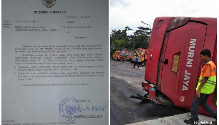 SERANG – Gubernur Banten Wahidin Halim mengeluarkan surat rekomendasi pembekuan izin PO Murni Jaya dan PO Murni dengan nomor 551/1548-DISHUB/19 perihal rekomendasi pemberian sanksi administrasi bus AKAP jurusan Labuan-Jakarta.