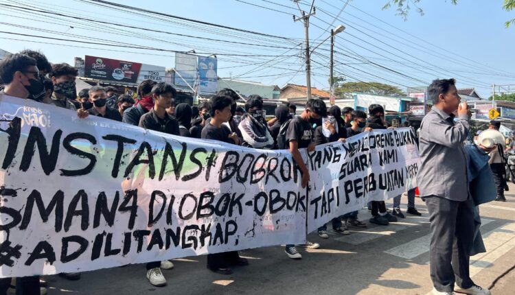 SERANG – Puluhan mahasiswa dan siswa yang tergabung dalam BEM Banten Bersatu bersama sejumlah siswa SMAN 4 Kota Serang hari ini menggelar aksi demonstrasi di depan gerbang sekolah SMAN 4 Kota Serang dengan grand issue instansi bobrok, SMAN 4 diobok-obok, Senin, (21/7/2025).