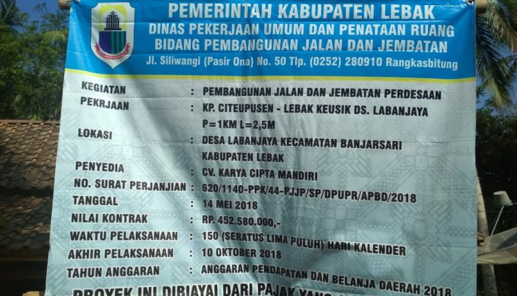 Pembangunan jalan poros desa yang berlokasi di Kampung Citeupusen, Desa Laban Jaya yang dikerjakan oleh CV. Karya Cipta Mandiri dengan nilai Anggaran sebesar Rp 452.580.000,- dari dana APBD 2018.
