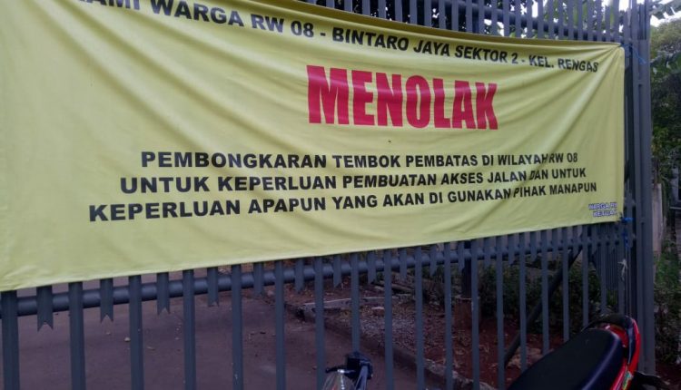 “Kami warga RW 08 Bintaro Jaya Sektor 2 menolak Pembongkaran tembok pembatas wilayah RW 08 untuk keperluan pembuatan akses jalan dan untuk keperluan apapun yang akan digunakan pihak manapun,” demikian bunyi penolakan warga tersebut. (*/Admin)