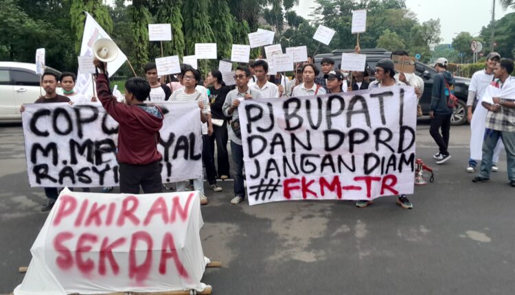 TANGERANG – Puluhan mahasiswa yang tergabung dalam Forum Komunikasi Mahasiswa Tangerang Raya menggelar aksi di depan kantor Bupati Tangerang, Kecamatan Tigaraksa, Kabupaten Tangerang.