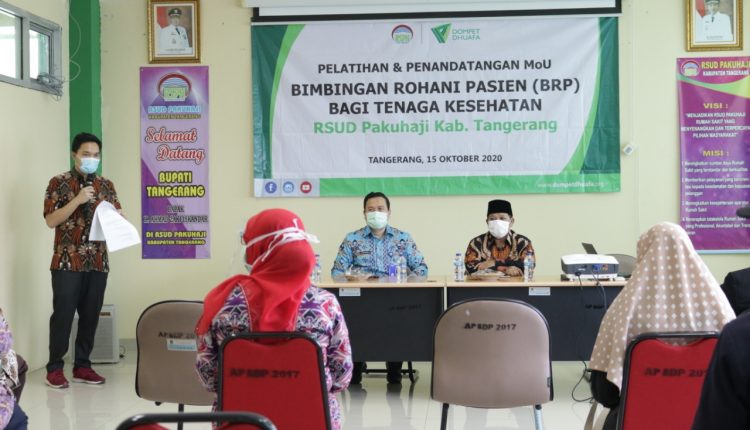 TANGERANG – Rumah Sakit Umum Daerah (RSUD) Pakuhaji, Tangerang menjalin kerjasama dengan Dompet Dhuafa, dalam program Layanan Bimbingan Rohani Pasien (BRP). Nota kesepakatan tersebut ditandatangani oleh dr. Hj. Corah Usman, MARS , selaku Direktur RSUD Pakuhaji Kab. Tangerang, dan Ahmad Shonhaji, MM selaku Direktur Budaya, Dakwah dan Pemerdayaan Masyarakat (BDPM) Dompet Dhuafa dan dilanjutkan dengan kegiatan training Urgensitas Bimbingan Spiritual dan Fiqh Sakit Praktis bagi 25 tenaga kesehatan pada Kamis (15/10/2020), di ruang Rapat Gedung Utama Lt.3 Ruang Aula Serbaguna RSUD Pakuhaji, Kabupaten Tangerang.