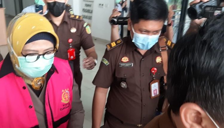 RJ keluar dari Gedung Kejari Kota Tangsel usai menjalani pemeriksaan dengan mengenakan rompi berwarna merah muda bertuliskan “Tahanan Tindak Pidana Korupsi Kejaksaan Negeri”, Kamis (10/6/2021).